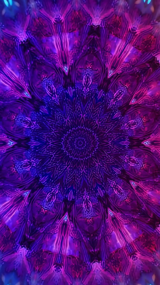- Pulsing Kaleidoscope Mandala Looping Vertical Video with Rotating Neon Purple and Cyan Rings