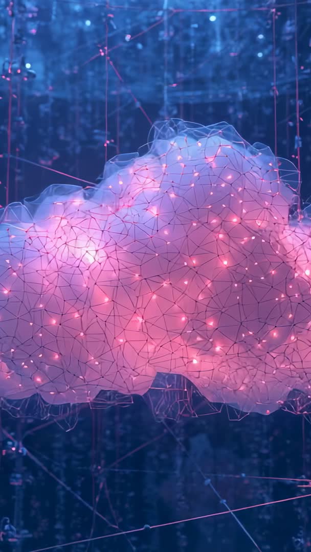 AI Generated Image. Showcasing suspended LED cloud with pulsing lights and shifting mesh nodes in vertical format, creating immersive futuristic ambience. Capturing slow drifting motion, subtle node pulses, and luminous color transitions for cinematic portrait displays. Serving as intro clip for tech product launches, exhibition promos, museum displays, music video backdrops, social media stories, app splash screens, and digital art galleries. Allowing easy looping, speed ramping, color grading, and overlaying text or logo. Evoking concepts of cloud computing, neural networks, connectivity, and data flow while highlighting sculptural lighting design.