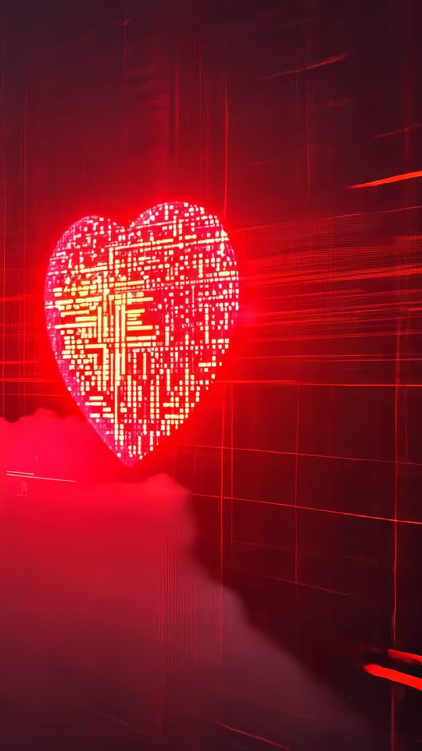 AI Generated Video. Vertical video featuring pulsing LED heart composed of circuit-like pixels, glowing red against neon grid, emitting horizontal light beams and dense smoke plumes. High-contrast neon palette creating cinematic cyberpunk mood, vibrant reds and deep blacks, dynamic pulse timing syncing with music beats. Foreground fog adding depth and light diffusion, grid lines providing retro-futuristic matrix feel. Suitable for music visuals, VJ loops, concert openers, club promotions, tech event branding, social media vertical ads, dating app campaigns, Valentine’s Day promotions, background for electronic music tracks, trailer bumpers, stage lighting demos, LED mapping tests. Loopable 9:16 vertical format, ready for color grading and speed adjustment, compatible with video editing and live visual software.