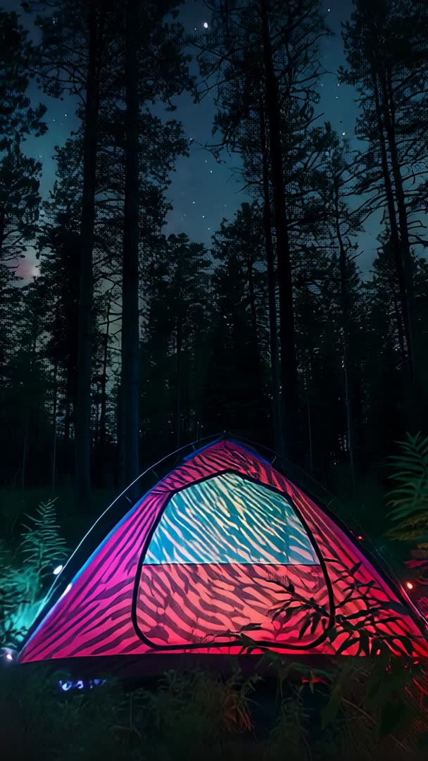 - Pulsing LED-lit zebra-striped tent glowing under starry pine forest sky | Vertical video