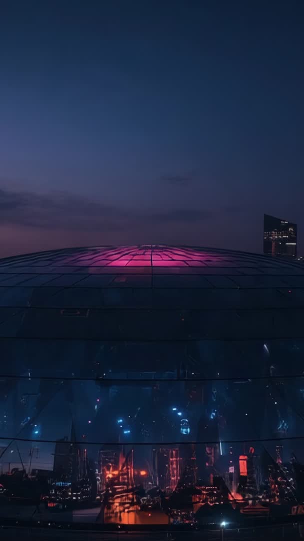 Pulsing Magenta LED Dome Reflecting Futuristic City Skyline at Dusk Vertical Video Video