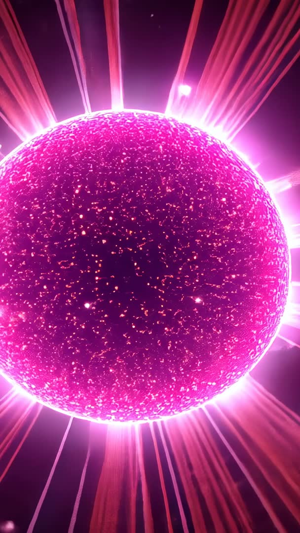 AI Generated Image. Pulsing magenta orb emitting elongated neon rays into dark void, casting sparkling glints across curved surface. Frame-by-frame motion creating rhythmic glow and streaking filaments that loop smoothly for vertical display. High-contrast color palette using vibrant pink and deep purple for dramatic neon look. Serving as vertical loop background for music videos, club visuals, DJ and VJ loops, livestream intros, mobile ads, social media stories, app splash screens, stage projection, futuristic title sequences. Pairing with electronic music, tech branding, sci-fi themes, product promos, creative transitions. Providing loopable clip for quick integration into editing timelines and motion design projects; allowing color grading and overlay blending for custom branding.