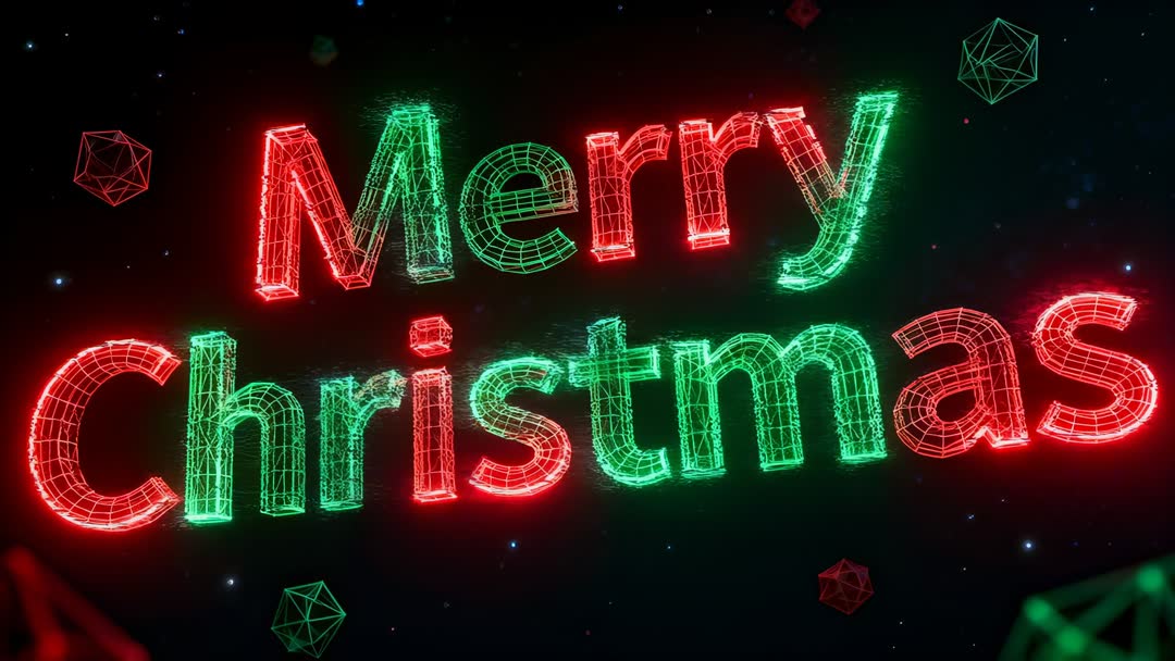 AI Generated Video. Looping video clip showing pulsing Merry Christmas 3D wireframe typography glowing against starfield, red and green polyhedra rotating slowly. Neon wireframe letters flickering and emitting particle sparks, creating futuristic festive mood. High contrast dark space and luminous typography providing strong visual impact for screen titles and intros. Suiting holiday advertising, e-card animation, social media banners, website hero panels, event openers, digital signage, and motion graphics overlays. Working well as looping backdrop for virtual events and livestream jingles, or for creating short promotional clips and animated greetings. Color palette focusing on red and green neon with black starry backdrop and cinematic depth.