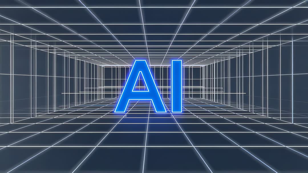 AI Generated Image. Featuring pulsing blue neon AI letters centered in expansive wireframe grid tunnel, showing continuous scaling and forward motion while conveying depth and futuristic tech energy. Composition combining strong central typography, vanishing-point perspective, and glowing grid lines for cinematic, high-tech look. Serving as dynamic hero motion for websites and app interfaces, boosting branding for AI startups and tech products, and enhancing keynote slides, product launch videos, social media promos, and conference visuals. Working well for title sequences, motion graphics overlays, streaming intros, podcast covers, and editorial pieces about artificial intelligence, machine learning, or virtual reality. Providing clean negative space for overlay text and logos and delivering modern cyberpunk aesthetic with blue neon glow and digital wireframe elements.