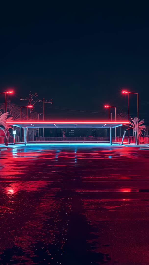 AI Generated Image. Vertical 9:16 loop showing neon-lit canopy and empty forecourt at night. Pulsing red and cyan LED strips outlining canopy while streetlights cast red highlights. Wet pavement reflecting neon colors and creating long glossy streaks across foreground. Palm silhouettes and minimal urban structures framing composition, evoking retro-futuristic cyberpunk mood and quiet late-night atmosphere. High contrast color palette and cinematic feel making strong visual statement. Usage ideas: Use as background for music visuals, synthwave or electronic tracks, streaming overlays, social media stories, mobile app splash screens, tech or automotive commercials, event promotion, website hero banners, or in-store digital signage. Pair with ambient synth soundtrack and bold typography for promo clips or title cards. Trim or loop for seamless vertical video backgrounds and story-format ads, or use still frames for print and web headers while maintaining neon aesthetic.