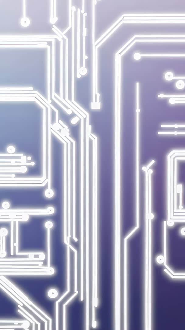 AI Generated Image. Vertical 9:16 clip featuring pulsing neon circuit lines and nodes on cool purple-blue gradient. Glowing white traces animating along schematic paths, suggesting data flow, connectivity, and electronic network activity. Minimal abstract composition keeping focus on lines and nodes while leaving ample negative space for text or logos. Providing seamless loop compatibility and mobile-first framing, fitting social stories, app intros, product launch reels, tech pitch decks, corporate innovation videos, and event visuals. Useful as background for titles, lower thirds, UI mockups, music visuals, and live VJ sets. Color and pulse speed matching brand identity through color grading and speed ramping for smooth integration into motion graphics projects.