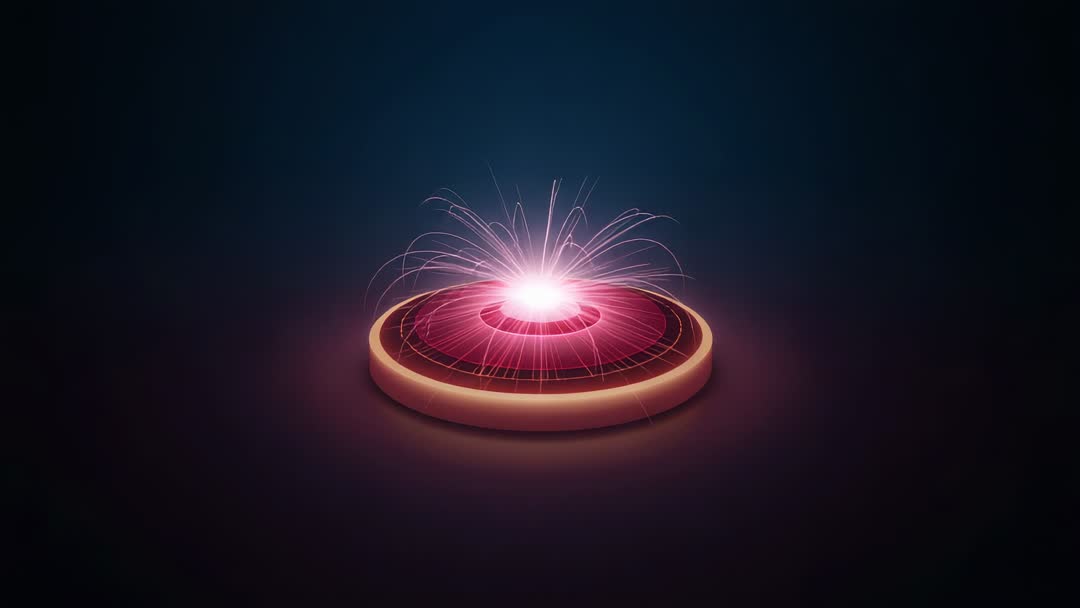 - Pulsing Neon Core Emitting Sparks from Futuristic Emitter Disk with Halo Rim