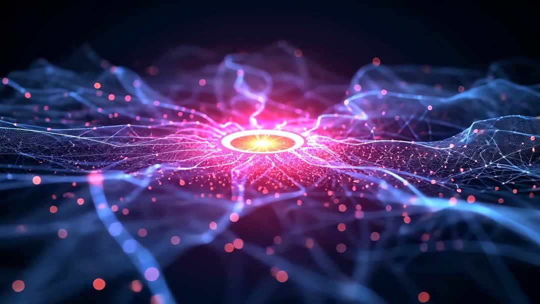 AI Generated Image. Video showing pulsing neon core sending streams of particles along filament-like network, creating sense of data flow and energy. Scene featuring glowing center, radiating filaments, particle bursts, and undulating mesh grid, using deep blues and magenta highlights. Serving as visual metaphor for AI, neural networks, data transfer, and distributed systems. Perfect for technology presentations, AI and machine learning explainers, product launch intros, website hero animations, corporate pitch decks, and science fiction trailers. Clip providing motion design elements for transitions, overlays, looping backgrounds, and title sequences. Visual emphasizing connectivity, information flow, system nodes, and high-tech aesthetics, ready for licensing in marketing, editorial, educational, and broadcast projects.