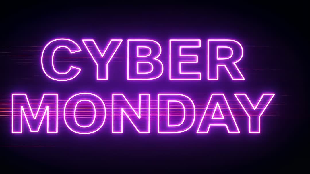 AI Generated Video. Glowing purple-magenta neon Cyber Monday text pulsing against dark backdrop while horizontal light streaks slide leftward. Bold outlined typography and soft bloom creating futuristic retro neon mood perfect for high-contrast video. Serving as attention-grabbing hero animation for Cyber Monday campaigns, online sale promos, email headers, website hero banners, social media ads, and in-store digital displays. Enabling easy combination with promotional copy, discount tags, animated CTAs, and product overlays. Working well as looping background for countdowns, short promo clips, or header animations to drive urgency and click-throughs.