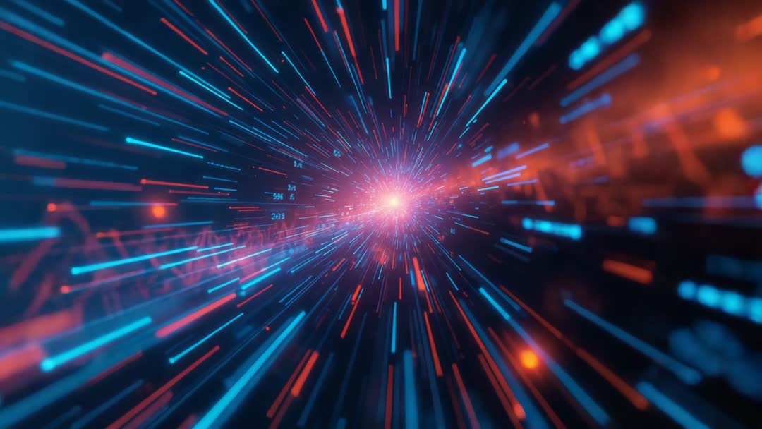 - Pulsing Neon Data Tunnel Racing Through Hyperspace with Radial Light Streaks and Code