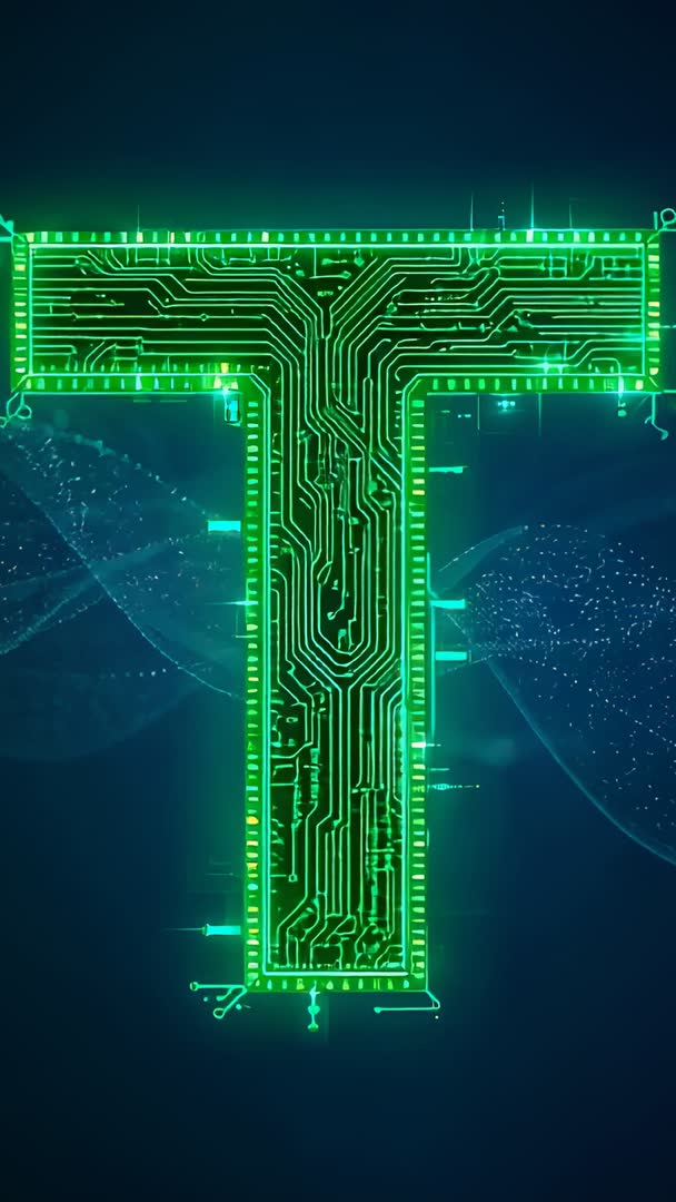 AI Generated Image. Showing pulsing neon green circuit traces forming letter T over deep blue digital backdrop with drifting particle waves and subtle glow. Featuring high-contrast PCB lines, animated light pulses and micro sparks for futuristic tech feel. Providing vertical 9:16 composition ideal for mobile-first platforms and social reels. Perfect for tech branding intros, app promos, AI and cybersecurity explainers, title sequences, product launches and event visuals. Suggestions for use: loop for continuous background, add central logo reveal or animated type overlay, pair with synth or electronic soundtrack, apply color grading to match brand palette, and use as hero clip for landing pages or vertical ads.