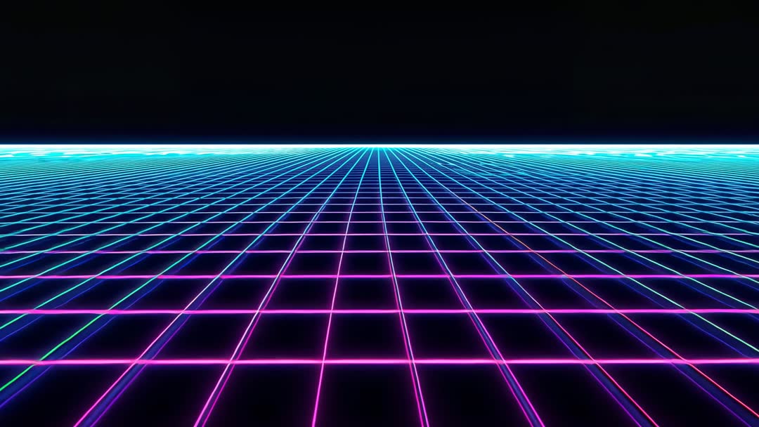 AI Generated Image. Looping retrofuturistic neon grid plane moving toward cyan horizon, offering dramatic depth and glowing color contrast. Enhancing music video backgrounds, DJ visual sets, livestream overlays, techno event promos. Supporting lower-third and title overlays while maintaining readable foreground. Working well for website hero backgrounds, social media ads, presentation slides, virtual stage backdrops. Allowing color grading and speed adjustment for tailoring mood from high-energy synthwave to calm ambient tech. Providing seamless loop options and high-resolution export for broadcast and streaming. Easily integrating logo animations, particle effects, text reveals for branding and promotional use.