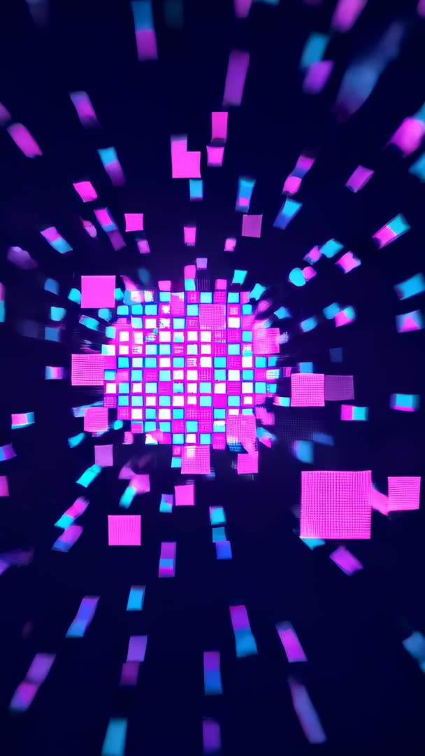 AI Generated Image. Vertical video showing pulsing neon grid at center, radiating glowing pink and cyan tiles outward into deep navy void. Floating squares and particles moving away from center with depth blur and motion trails, creating hypnotic tunnel effect. High-contrast color palette matching energetic electronic music or chill synthwave moods. Loop-friendly composition suiting social media stories, mobile ads, music visualizers, app intros, stage backdrops, and tech product promos. Clip working well for transitions, title reveals, logo stings, and background plates for motion graphics. Pair with bass-heavy electronic soundtrack, soft synth pads, and quick percussive hits to enhance rhythm. Vertical framing and vibrant contrast making clip ideal for mobile-first delivery, portrait video campaigns, promotional reels, VJ loops, event visuals, and motion design templates.