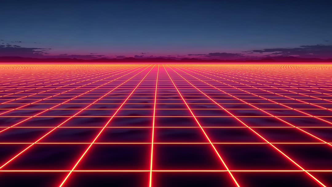 AI Generated Image. Showing pulsing neon grid stretching toward horizon at dusk, with magenta lines forming strong vanishing point perspective. Evoking synthwave retrofuturism and 1980s nostalgia while maintaining modern futuristic tone. Featuring wide aspect ratio and slow camera push, creating immersive forward motion and dramatic depth. Working well for music video intros, title sequences, VJ visuals, website hero backgrounds, event promos, DJ set loops, and album or poster artwork. Providing loopable clip for seamless playback and clear space for overlaying text or logo. Offering high contrast palette with deep indigo sky and warm neon lattice for bold cinematic impact.