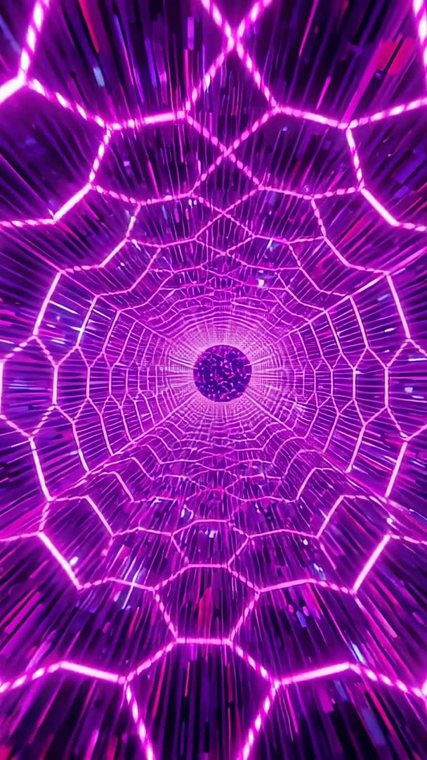 AI Generated Image. Looping neon hexagon tunnel creating sensation of forward motion and depth, with pulsing magenta particle center adding energetic sparkle and motion trails. High-contrast purple and magenta palette providing futuristic vibrant atmosphere and strong vanishing point for dynamic composition. Ideal for use as background for music videos, electronic event visuals, festival projections, livestream overlays, product reveals, smartphone vertical reels, app intros, tech conference openers, social media ads, and VR experiences. Compatible with looping playback and editing timelines. Suggested usage includes beat-synced cuts, color grading to match brand palette, blending with typography and logo animation, or layering with sound design for immersive promotional content. Vertical aspect optimized for mobile-first platforms and short-form vertical content.