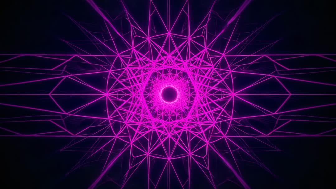 AI Generated Image. Pulsing neon lattice radiating from glowing core, forming concentric hex rings and interlocking triangles against deep black backdrop. Layered polygonal lines creating sense of depth and forward motion, producing hypnotic kaleidoscopic tunnel suited for seamless looping. High-contrast neon pink palette enhancing futuristic cyberpunk mood and digital energy. Ideal for music visualizers, VJ loops, electronic music promos, sci-fi trailers, tech brand intros, background animation for websites and apps, social media motion posts, album artwork, and projection mapping. Delivering seamless loop ready for motion graphics projects, stage visuals, and immersive installations. Allowing easy color grading and speed adjustments for brand matching and tempo synchronization.