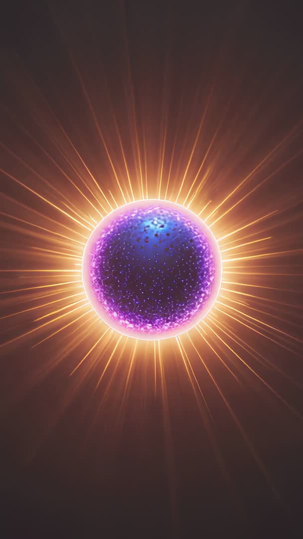 AI Generated Image. Looping 10-second vertical clip showing pulsing central sphere emitting magenta halo and radiant golden rays. Sphere surface showing blue and purple particle speckles and subtle motion noise, creating hypnotic energy effect. Frame captured at loop start for preview. Ideal for social media stories, mobile wallpapers, vertical ads, music visualizers, VJ backgrounds, app splash screens. Pairing with ambient music or synth textures, overlaying text or logos, using as intro loop for podcasts or livestreams. Allowing easy tint adjustments; loop points rendered seamless for continuous playback. Available in 4K vertical format and optimized for mobile playback, useful for promotional reels, futuristic UI mockups, meditation apps, and nightlife visuals.