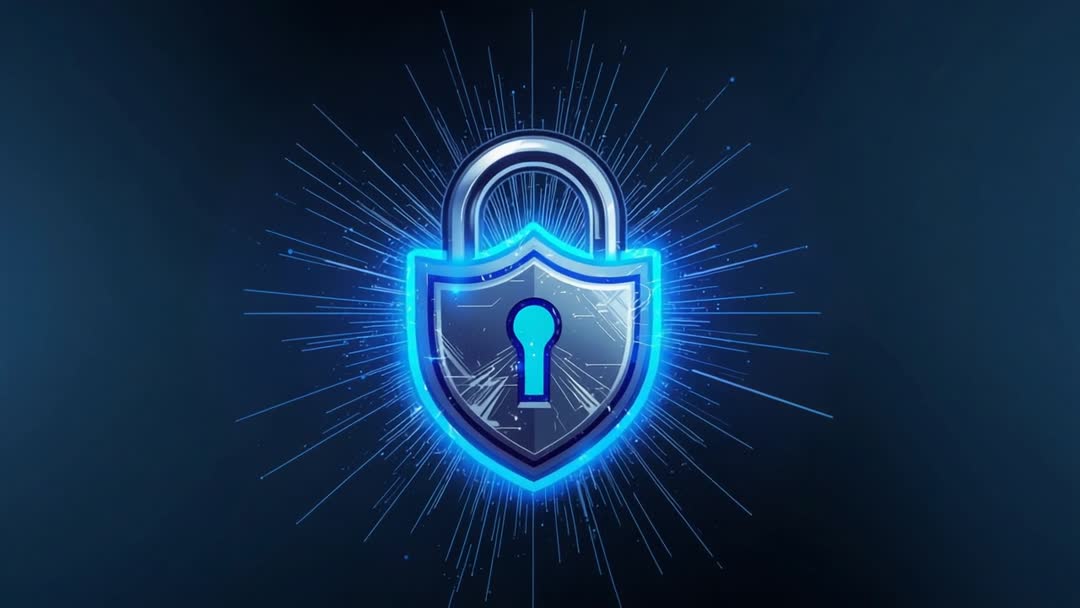 AI Generated Image. Pulsing neon padlock shield animation centered on dark blue gradient backdrop, showing metallic lock with glowing cyan outline and keyhole icon. Sparks and radial light rays radiating outward, creating energetic security visual. Cracked glass texture on shield adding dramatic tension and visual depth. Suitable for use in cybersecurity branding, app intros, website hero sections, product demo videos, corporate training, social media ads, and broadcast graphics. Working well as loopable background, intro bumper, lower third element, or explainer video opener. Colors and motion emphasizing trust, protection, encryption, and digital safety. Providing high-contrast focal point for overlaying text, logos, or call-to-action. Compatible with tech presentations, IT marketing, SaaS landing pages, security reports, and conference visuals. Optimized for quick integration into editing timelines and motion design projects.