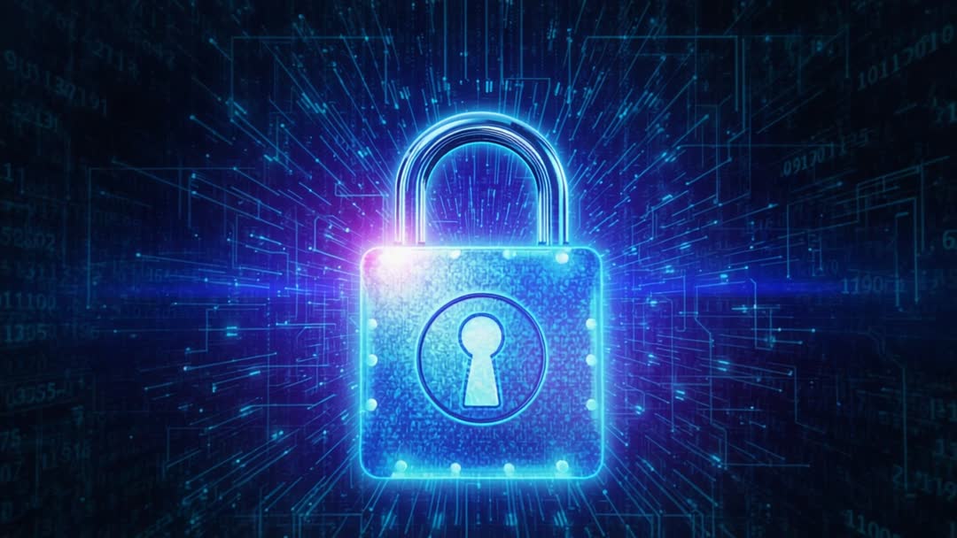 AI Generated Image. Looping video clip showing pulsing neon padlock zooming forward through digital particles and circuitry while lens flare and sparks radiating from lock edge. Visual mood is electric blue and cyan with subtle purple highlights, conveying futuristic security and encrypted data flow. Useful for illustrating encryption, secure login, cyber resilience, VPN services, firewall protection, authentication systems, and corporate IT campaigns. Works well as hero background for website header, explainer video opener, trade show screen, social media ad, product demo, or training module. Recommended treatments: add subtle parallax text layer for headline, apply light vignette to focus on lock, use lower-third overlays for messaging. Suitable for widescreen 16:9 layouts, looping background scenes, and short promotional clips emphasizing trust and technology.