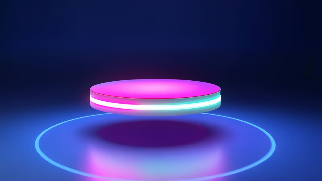 AI Generated Image. Showing pulsing neon disc hovering above cyan ring on polished reflective floor inside deep blue studio. Featuring vivid pink and cyan LED glow, soft halo and strong mirror reflection for dramatic visual impact. Offering minimal futuristic stage ideal for product showcase, technology promo, UI teaser, music visualizer, livestream overlay, event opener or website hero background. Providing loopable motion and clean negative space for logo and text placement, easy color grading and seamless integration into motion graphics projects. Serving well for advertising, branding, social media clips, presentation intros and virtual event graphics.