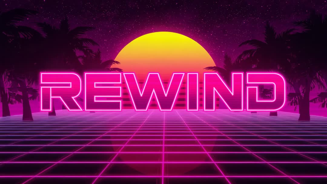 - Pulsing neon REWIND over retro pink grid at sunset with palm silhouettes, synthwave glow