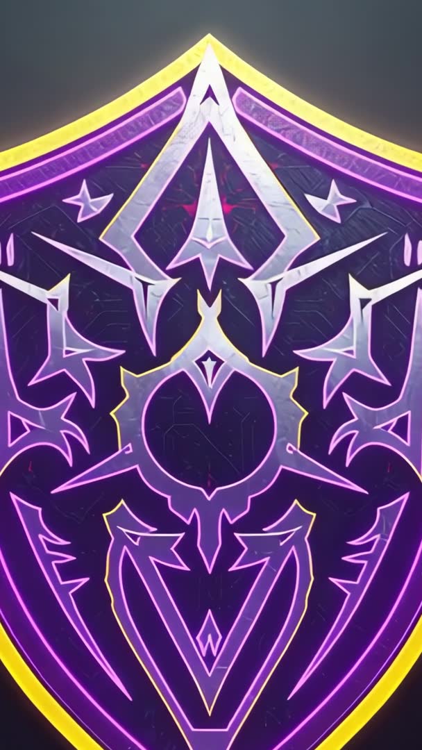 AI Generated Image. Vertical 9:16 loopable clip showing pulsing neon shield emblem with metallic textures, gold rim, and vivid purple inner glow tracing complex symmetrical lines. Visual featuring high-contrast neon lighting, subtle particle noise, and crisp vector edges for clean masking and color grading. Ideal for logo reveal, channel intro, streaming overlay, game UI element, or mobile wallpaper. Recommend placing branding text in lower third or top safe area to preserve emblem visibility. Suggest using blend modes screen or add when overlaying onto footage and pairing with bold geometric or techno fonts for cohesive tech aesthetic. Use in promotional reels, sci-fi trailers, esports branding, app splash screens, social media ads, or title sequences to convey futuristic, high-tech identity.
