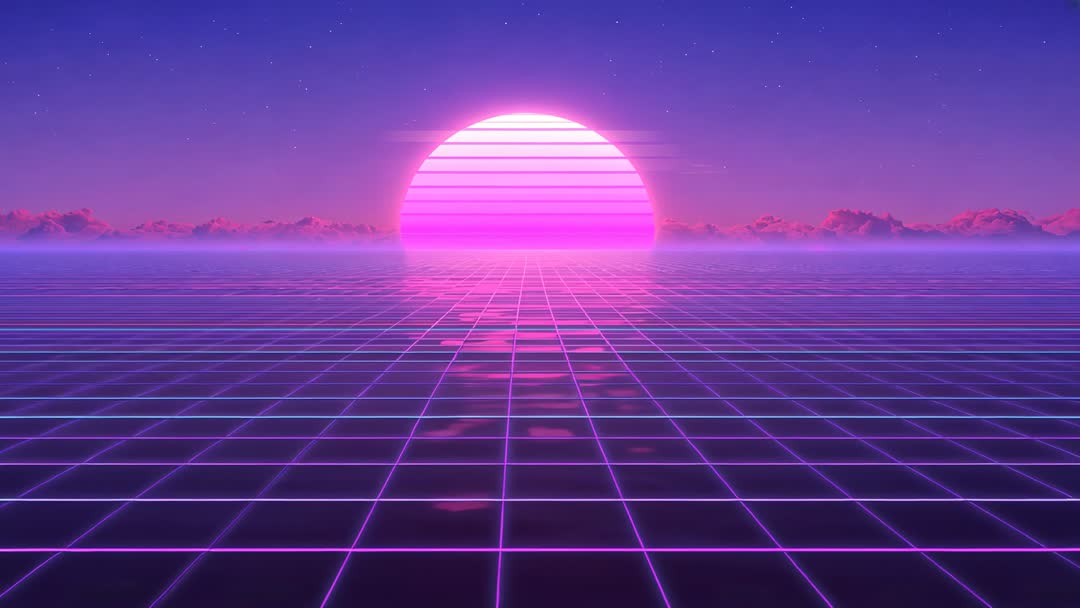 AI Generated Image. Looping synthwave sun pulsing over tiled neon grid while clouds reflecting glowing bands and stars twinkling overhead. Delivering seamless loop for music video backgrounds, livestream overlays, DJ visuals, retro game intros, website hero banners. Featuring magenta-violet-cyan palette evoking nostalgic 1980s mood. Allowing editors to customize loop speed, color grade, and film grain for brand match. Working well for album art animations, social media motion ads, cinematic title openers, event projection mapping, and virtual backgrounds for streams and calls.