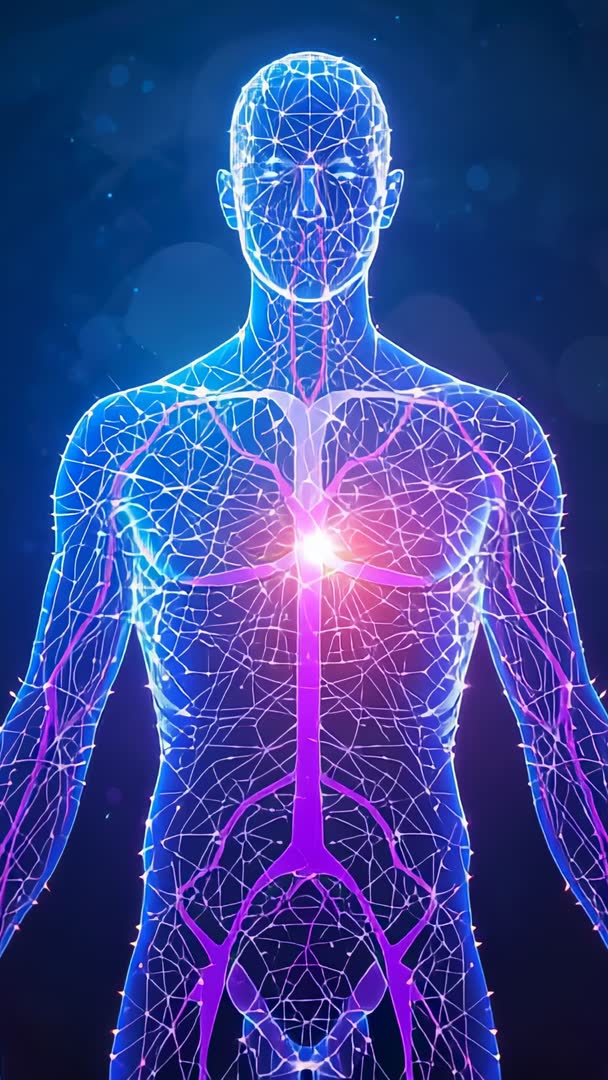 AI Generated Image. Showing pulsing neon torso with glowing magenta core at chest, intricate network of illuminated lines tracing anatomy, camera smoothly zooming through starfield particles. Employing vivid blue and magenta color palette with dynamic flashes and central pulse highlight to create futuristic, high-tech mood. Working well as loopable vertical clip for mobile ads, app intros, biotech product demos, medical education, science documentaries, conference visuals, and social media reels. Enabling overlay of titles, logos, data labels, and call-to-action text while maintaining clear focal point at magenta core for branding or instructional emphasis.