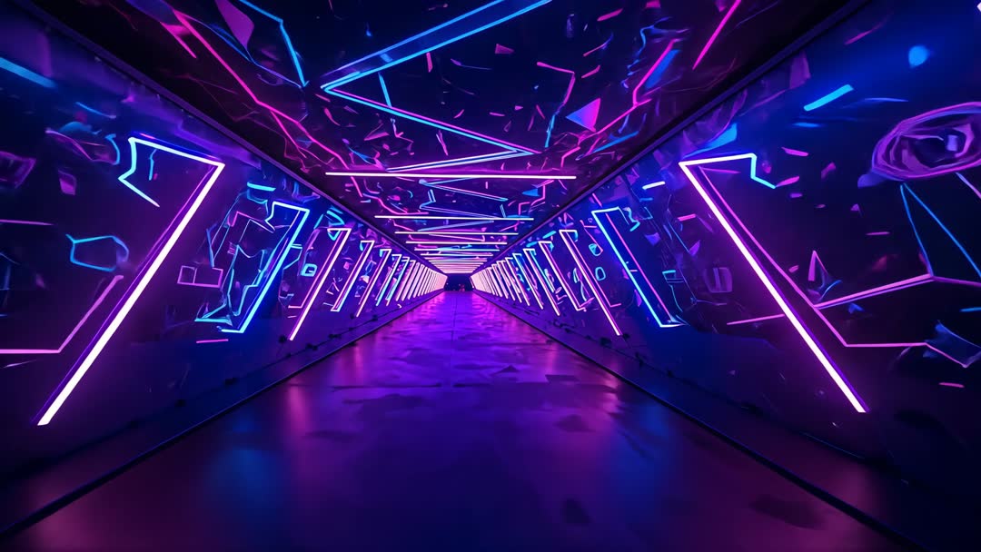 AI Generated Image. Video showing pulsing neon-lit tunnel with magenta and cyan LED strips forming repeating geometric frames, drawing eye toward distant vanishing point. Surfaces showing reflective finish and projection-mapped fragments creating dynamic depth and motion. Lighting pulses and color shifts creating hypnotic rhythm ideal for looped playback. Visual mood evoking futuristic cyberpunk and high-tech aesthetics, working well for music video backdrops, club visuals, VJ loops, stage projections, title sequences, and broadcast openers. File fitting website hero backgrounds, social media clips, product launch reels, virtual reality lobbies, and tech conference openers. Editors able to loop, color-grade, and crop for widescreen or vertical formats while maintaining strong symmetry, perspective, and immersive depth.
