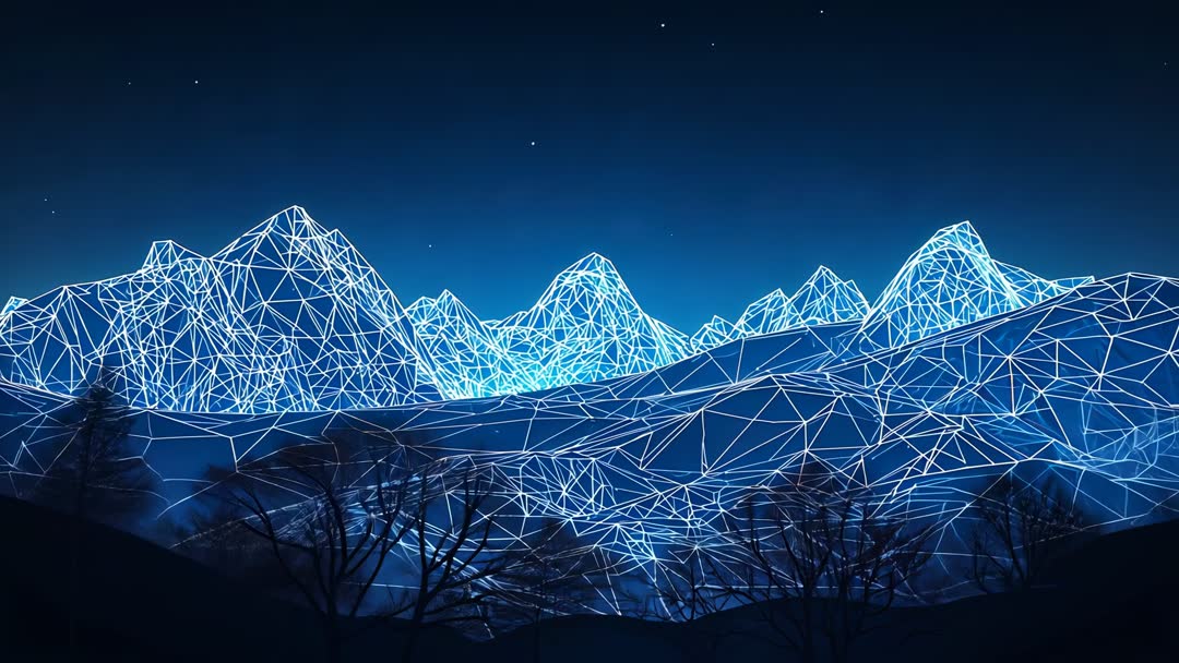 AI Generated Image. Pulsing neon wireframe mountains revealing valley contours while camera is panning across luminous geometric ridgelines, stars twinkling overhead, silhouetted trees flashing red in foreground. Cyan and deep blue palette creating futuristic, cinematic atmosphere with high-contrast glow. Designed for loopable background use, title sequence and intro animations, electronic music visuals, technology and AI-themed promos, website hero banners, broadcast segments, VR experiences and social media content. Easy customization opportunities: adjust color grading, layer typography and logos, extend loop length, replace foreground elements. Recommended export: 4K video, 60fps for smooth panning and transparent alpha versions for compositing.