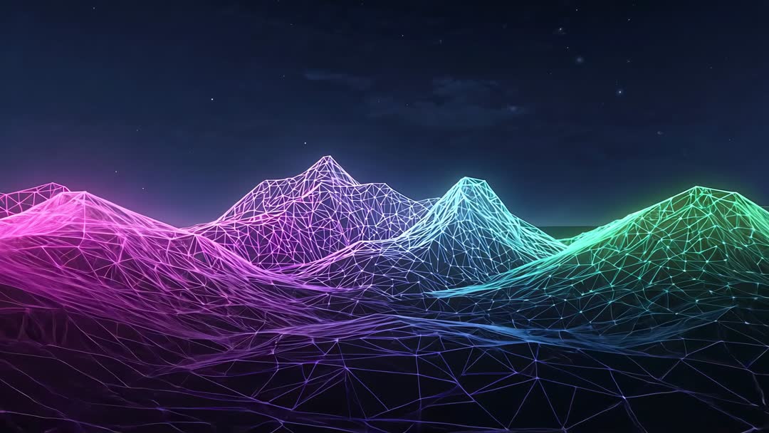 AI Generated Image. Video featuring pulsing neon wireframe mountains undulating beneath starry night sky. Mesh grid displaying magenta, cyan, green gradients across jagged peaks and valleys. Slow panoramic movement and subtle glow creating hypnotic retro-futuristic atmosphere ideal for music visualizers, title sequences, website hero banners, and event projections. High-contrast palette translating well to motion backgrounds for tech presentations, synthwave album visuals, cyberpunk trailers, and broadcast lower thirds. Seamless loop potential for ambient displays and interactive installations. Color correcting and speed ramping guiding customization of mood and tempo.