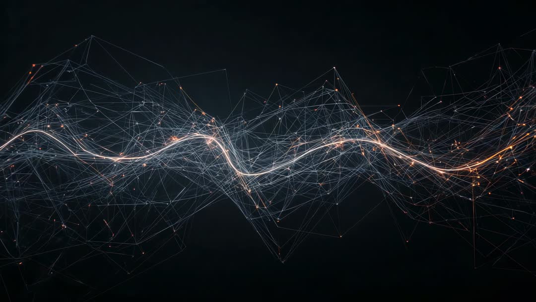 AI Generated Image. Central waveform pulsing and undulating across dark void, tracing bright neon path through intricate wireframe mesh. Tiny nodes glowing and sparking while fine connection lines crisscross, suggesting data flow, network connectivity and signal transmission. Layered depth and subtle motion hints creating cinematic tech atmosphere ideal for animated sequences. Suggested uses: website hero backgrounds, AI or software product intros, corporate presentation openers, data visualization overlays, broadcast graphics and social media motion posts, music visualizers and album visuals, poster and cover art, conference stage backdrops. Production tips: prepare as loopable clip for seamless playback, apply slow parallax zoom or horizontal pan, add lower-third text overlay and subtle vignette, color grade to match brand palette, use blend modes such as screen or add for luminous highlights, export in MP4 for web and ProRes for broadcast.