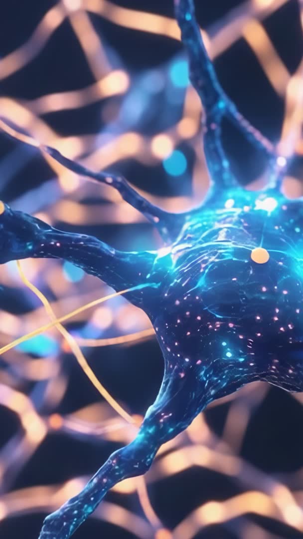 AI Generated Image. Vertical video clip showing pulsing neuron body emitting glowing orbs moving along thin filaments, creating sense of active signal flow. Electric pulses traveling through interconnected synapses, bioluminescent spots highlighting neural pathways and connectivity. Deep blue and warm amber tones creating high-contrast futuristic mood suitable for science and tech narratives. Use for neuroscience presentations, medical education videos, biotech marketing, conference openers, or social media vertical ads. Also suitable for background loops, app intros, motion graphics, visual effects in documentaries, or hero visuals on websites. Include text overlays or animated diagrams to explain concept of signal transmission and neural connectivity.
