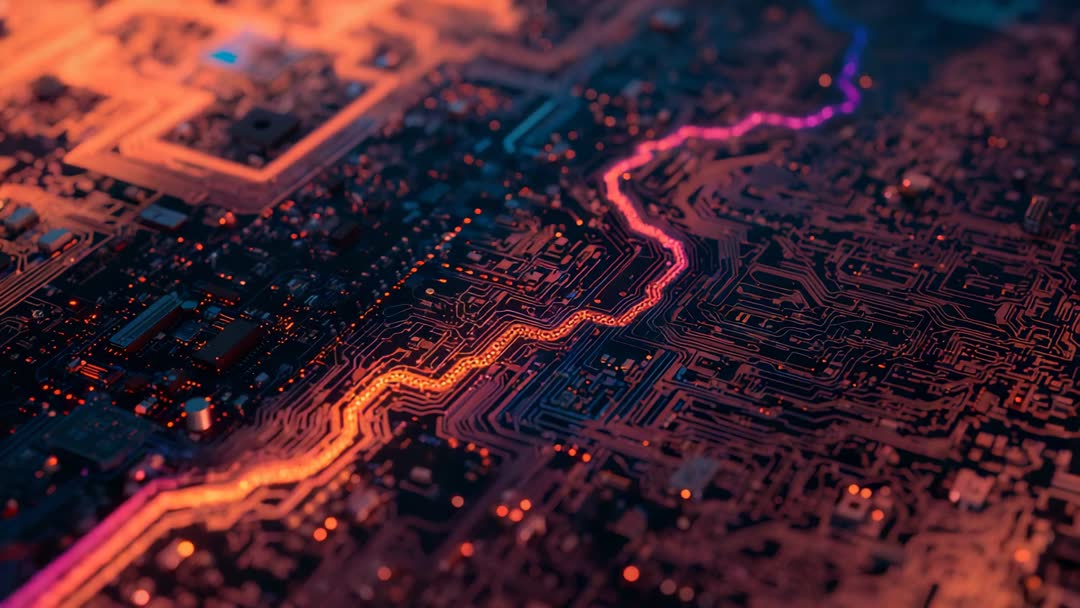 AI Generated Image. Showcasing pulsing orange trace flowing over complex PCB while camera shifting to reveal blue currents representing data flow. Macro framing capturing fine copper traces and onboard components, shallow depth of field producing cinematic bokeh of glowing pads. Neon palette combining warm orange and cool blue, producing high-contrast futuristic look ideal for tech storytelling and visualizing abstract network concepts. Useful for technology presentations, cybersecurity explainers, AI concept animations, electronic product launches, website hero backgrounds, conference openers, social media promos, and broadcast graphics. Clip loop-friendly for continuous backgrounds; recommended edits include color grading to match brand palette, overlaying animated HUD elements or text, adding subtle glitch or scanline effects, and varying playback speed for dramatic emphasis. Licensing suitable for commercial use in ads, corporate videos, and educational material.