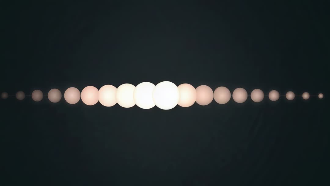 AI Generated Image. Showing pulsing row of glowing discs arranged horizontally, forming two larger spheres linked by slender connecting line. Center discs emitting warm white glow while outer discs fading into soft amber, creating gradient radial light and subtle motion ripple. Composed with dark negative space for high contrast and cinematic mood. Serving loopable background for website hero headers, app splash screens, corporate presentations, motion design reels, music visualizers, title intros, product launch videos, and social media loops. Working well for sci-fi themes, technology concepts, audio-reactive visuals, ambient meditation content, and background for overlay text or logos. Offering smooth animation and calm tempo for easy editing, color grading, and seamless looping.