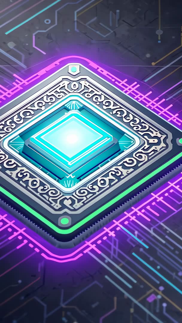 - Pulsing ornate processor glowing cyan core with neon circuit traces | Vertical video