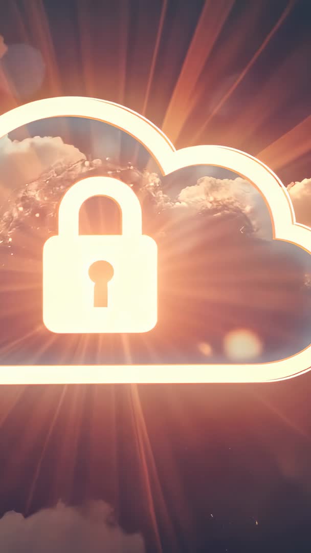 AI Generated Image. Video shows pulsing padlock inside glowing cloud icon floating against dark sky, with dramatic light rays, lens flares and sparks, conveying cloud security and data protection. Vertical 9:16 composition delivering cinematic, immersive feel for mobile-first platforms. Ideal for cybersecurity presentations, website hero backgrounds, app intro screens, corporate IT training videos, cloud service promos and startup pitch decks. Colors using warm gold glow and deep blue shadows creating modern, high-tech mood. File suits looping background, short marketing clips, social media ads, explainer videos and title sequences.