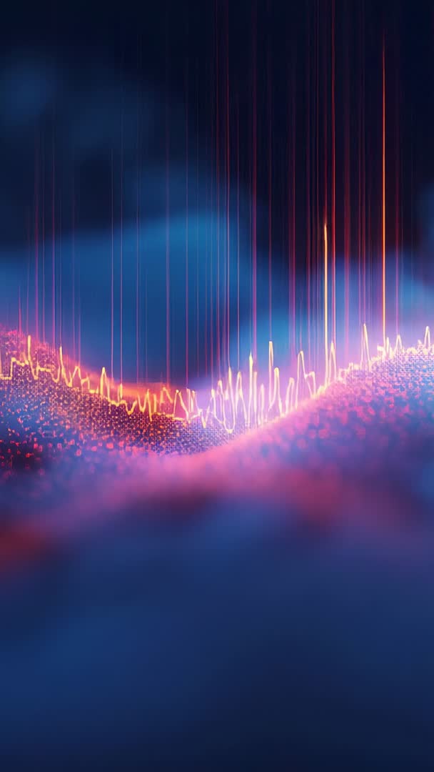 AI Generated Image. Vertical loop showing pulsing particle ridge glowing neon waveform over hazy blue and magenta gradient. Fine granule field forming rolling waves while vertical light streaks extend upward and waveform trace pulses along ridge. High-contrast neon palette with orange highlights creating energy and depth. Use for tech promos, app intros, music visualizers, live VJ loops, social media stories, mobile ads, UI backgrounds, conference interstitials. Provide safe zones at top and bottom for overlay text and logos; keep important elements near center ridge. Compatible with Premiere Pro, After Effects, Final Cut Pro for motion editing and color grading. Deliver as loopable MP4 or MOV vertical clip at 9:16 ratio for mobile-first campaigns.