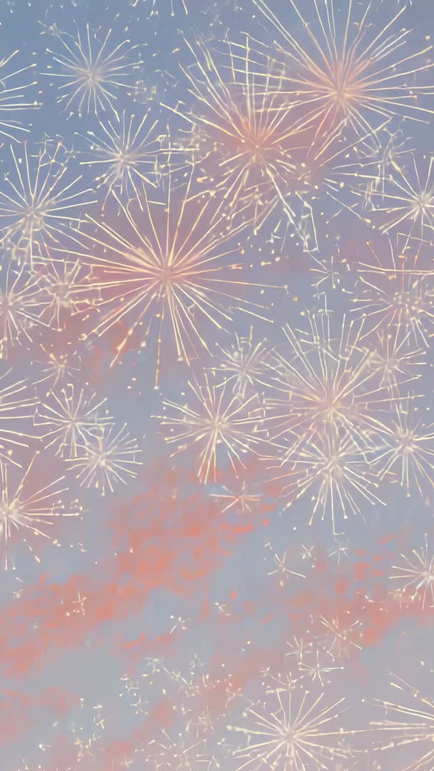AI Generated Video. Video showing pulsing radial bursts exploding into soft sparks across pastel dusk sky, creating warm glow and drifting pink cloud wash. Ideal for use as looping background for social media stories, phone lock screens, event promotions, digital invitations, or title intros. Visual working well with slow music tracks, voiceover, or text overlays for holiday campaigns, wedding promos, New Year and celebration content. Color palette offering soft pastel tones that complement lifestyle, fashion, and romantic branding. Clip delivering calm festive energy while remaining abstract and versatile for portrait and mobile-first projects.