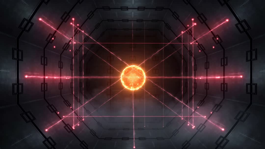 - Pulsing Plasma Orb Powering Magenta Laser Grid Inside Octagonal Reactor Chamber