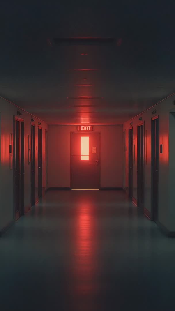 - Pulsing red exit light illuminating empty corridor, cinematic vertical video for suspense