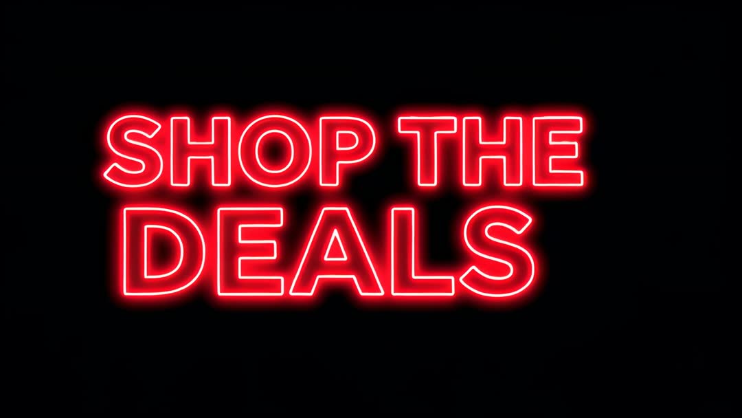 - Pulsing Red Neon Headline Shop Deals Sliding Into Frame on Black Void for Sales Promo