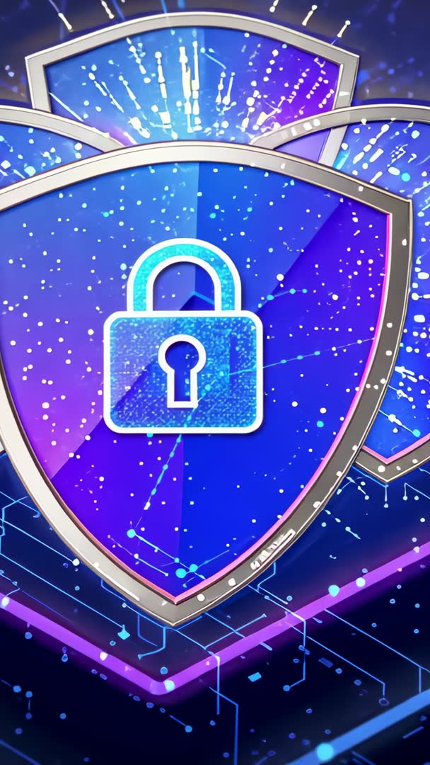 AI Generated Image. Vertical video showing pulsing sparks radiating from central shield and advancing across neon cyber grid, revealing glowing padlock symbol representing encryption and data protection. Color palette featuring electric blue and violet with metallic silver rim. Motion design including particle bursts, circuit traces, and subtle camera push for cinematic depth. Perfect for cybersecurity promo, app intro, corporate security presentation, product demo, training module, website hero banner, mobile app splash, or social media ad. Easily customizable for branding by replacing padlock icon, adjusting color scheme, or adding logo and text overlays. Loop-friendly for background or hero animations. Optimized for vertical mobile formats and story ads, supporting HD and 4K workflows.