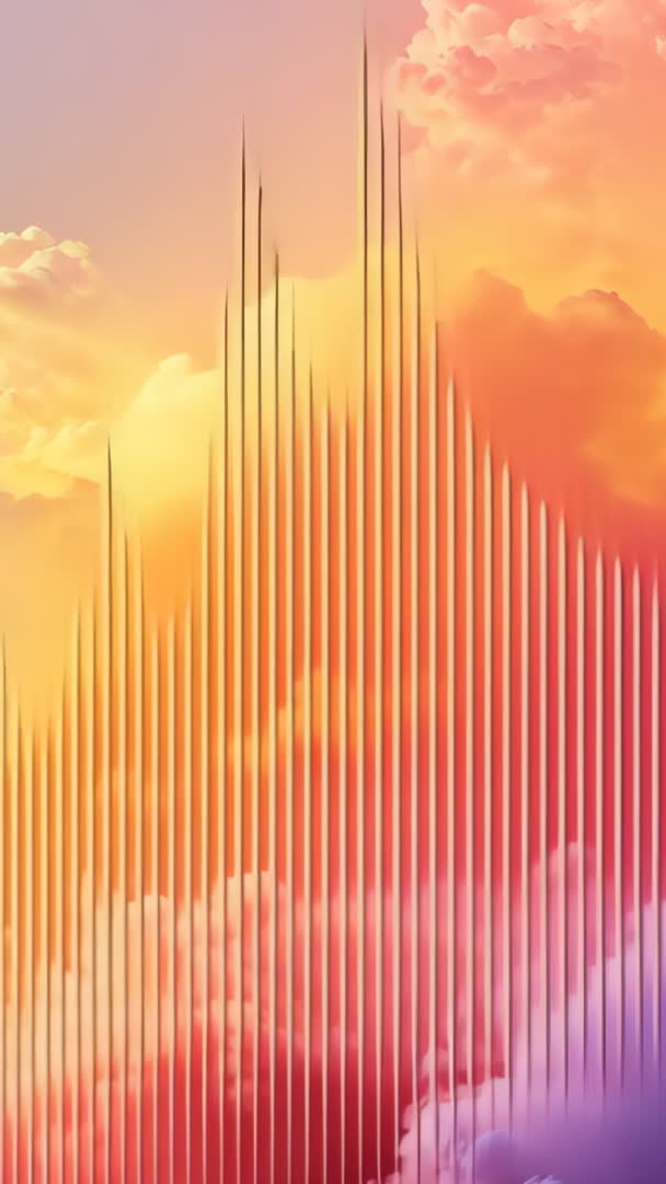 AI Generated Image. Vertical loopable video showing pulsing spectrum bars rising and falling in sync with audio over pastel cloudscape at sunrise-like gradient. Bars forming mountain-shaped peak and cascading downward in rhythmic motion, evoking musical energy and uplift. Warm orange, pink, purple hues blending through soft clouds, creating dreamy atmospheric backdrop complementing electronic music, ambient soundtracks, cinematic intros. Thin vertical lines adding modern, futuristic feel while maintaining clear space for titles, captions, waveform overlays. Loopable 9:16 format offering smooth easing transitions and high color saturation, suitable for quick edits and seamless repeats. Use for social media vertical videos, music promotion stories, DJ live streams, streaming channel intros, mobile wallpapers, app launch screens, concert visuals, meditation or ambient music channels, background for podcasts or audio-reactive visuals. Works well as background for promotional reels, title sequences, festival visuals, podcast cover loops, brand campaigns focusing on music, tech, lifestyle. Provide editable overlays and color grades in Premiere Pro or After Effects to match brand palette.