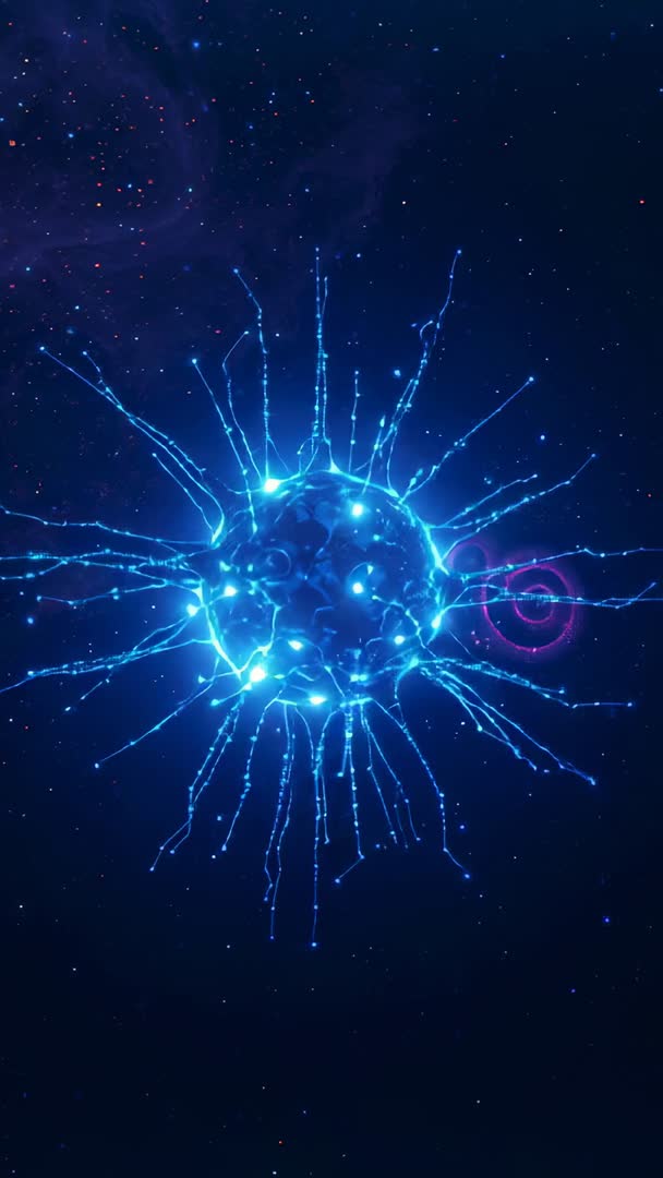 AI Generated Image. Pulsing spiky energy orb sending electric sparks along radiating tendrils against nebula backdrop. Bright blue core emitting bioluminescent beads and glimmering particles while magenta ring pulses near right side. Vertical video 9:16 composition optimizing for mobile stories, reels, portrait displays. Suiting sci-fi trailer background, tech product intro, VJ loop, music visualizer, app splash animation, and cosmic concept presentations. Loop-friendly motion offering smooth glow transitions and continuous particle trails for seamless repeats. Color palette focusing on neon blue with magenta accent and deep space navy contrast. Delivery suggestions: export in 4K vertical using H.264 or ProRes, include alpha matte for overlay use. Licensing ideas: streaming, broadcast, social campaigns, digital signage, educational space media. Editable within After Effects, Blender, and common motion graphics pipelines.