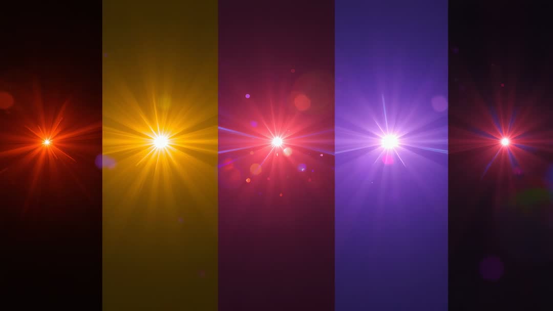 AI Generated Image. Showing five starburst lights pulsing and shifting across dark canvas divided by vertical color panels. Featuring bright lens flares, radial rays, soft bokeh orbs and subtle vignette. Color palette moving from warm red and gold to magenta and violet, creating dynamic contrast and depth. Motion pacing designed for loopable playback with rhythmic pulses and occasional flare bursts. Working well behind text or logos for title sequences, music videos, broadcast intros, VJ loops, event visuals and social media promos. Easy to customize with color grading, speed ramping, blend modes and overlay effects to match brand or mood. Delivering cinematic modern visual energy for creative and commercial projects.