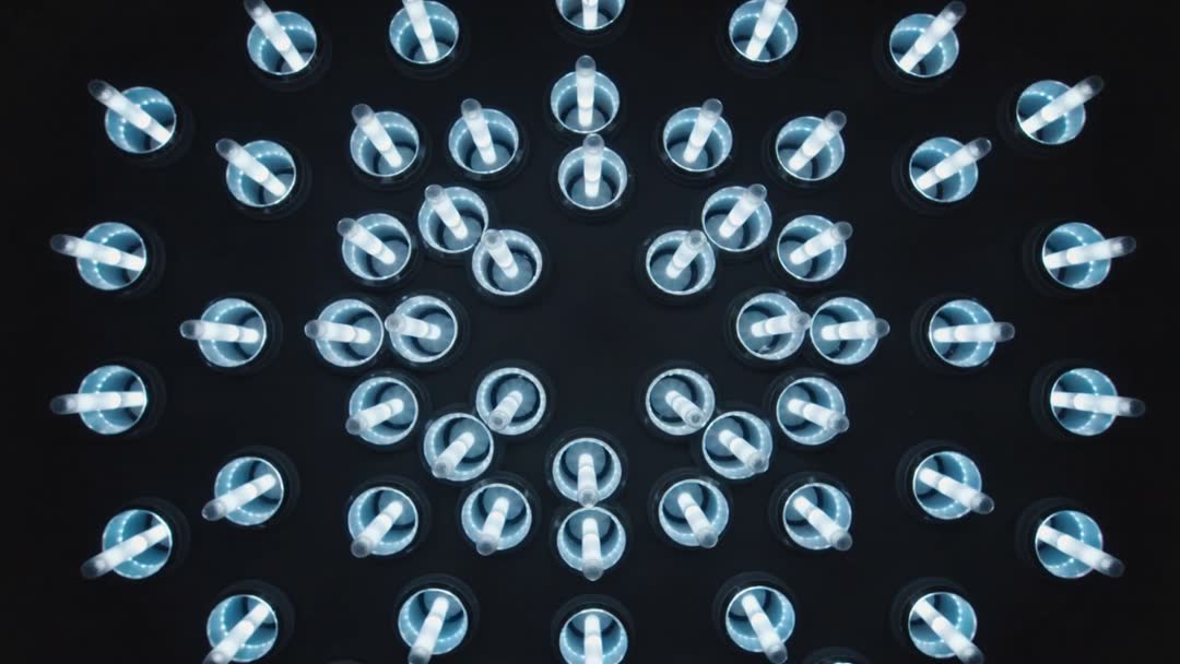 Pulsing Top-Down LED Array Creating Radial Cyan Halos Over Circular Cups and Straws Video