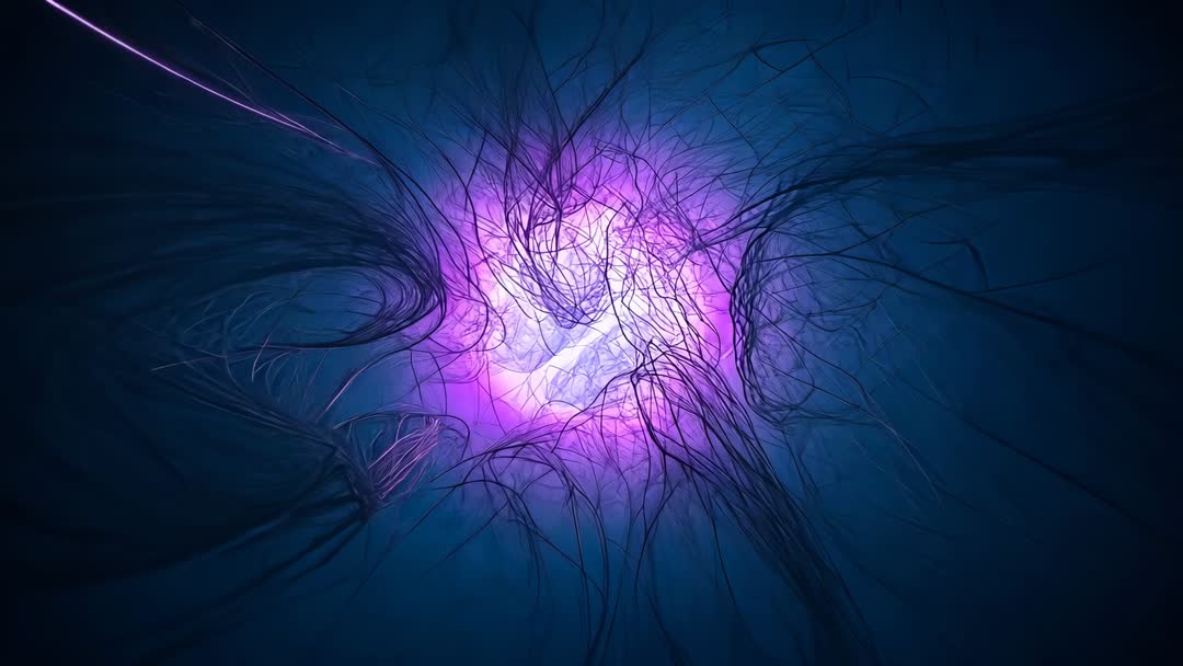 AI Generated Image. Pulsing violet core reacting to incoming purple streak, energy filaments extending into deep blue void. Offering high-contrast purple-blue palette, glowing halo and intricate filament detail for cinematic impact. Suited for sci-fi trailers, electronic music visuals, tech product launches, AI and neural network concept videos, science documentaries. Working well as background loop, title reveal, transition element, or visualizer for live performances and streaming. Providing motion-friendly composition for slow push-in, particle blend, color grading, and overlay with typography. Delivering modern, mysterious mood for branding, editorial packages, pitch decks, and immersive installations.