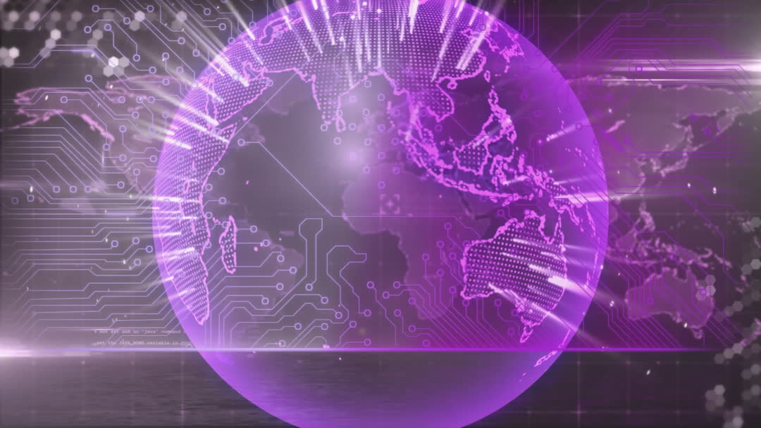 - Purple Digital Globe with Technology Theme Spinning Over World Map