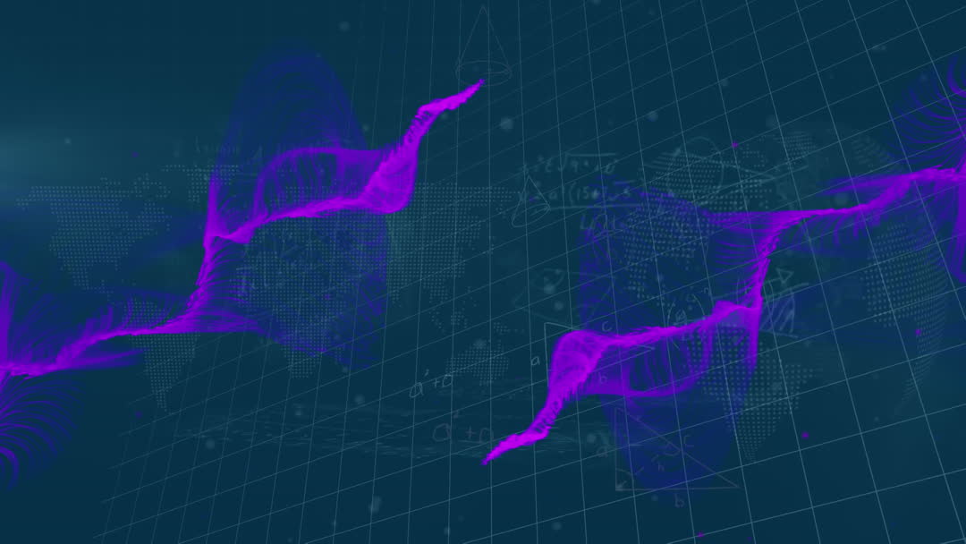 This animated illustration features dynamic purple waves flowing across a digital grid backdrop, with a blend of global maps and mathematical equations. It visualizes concepts of data processing and global business digital transformation. Perfect for use in technology-driven content, innovative business presentations, and digital marketing materials to convey themes of advanced analytics or digital networks.